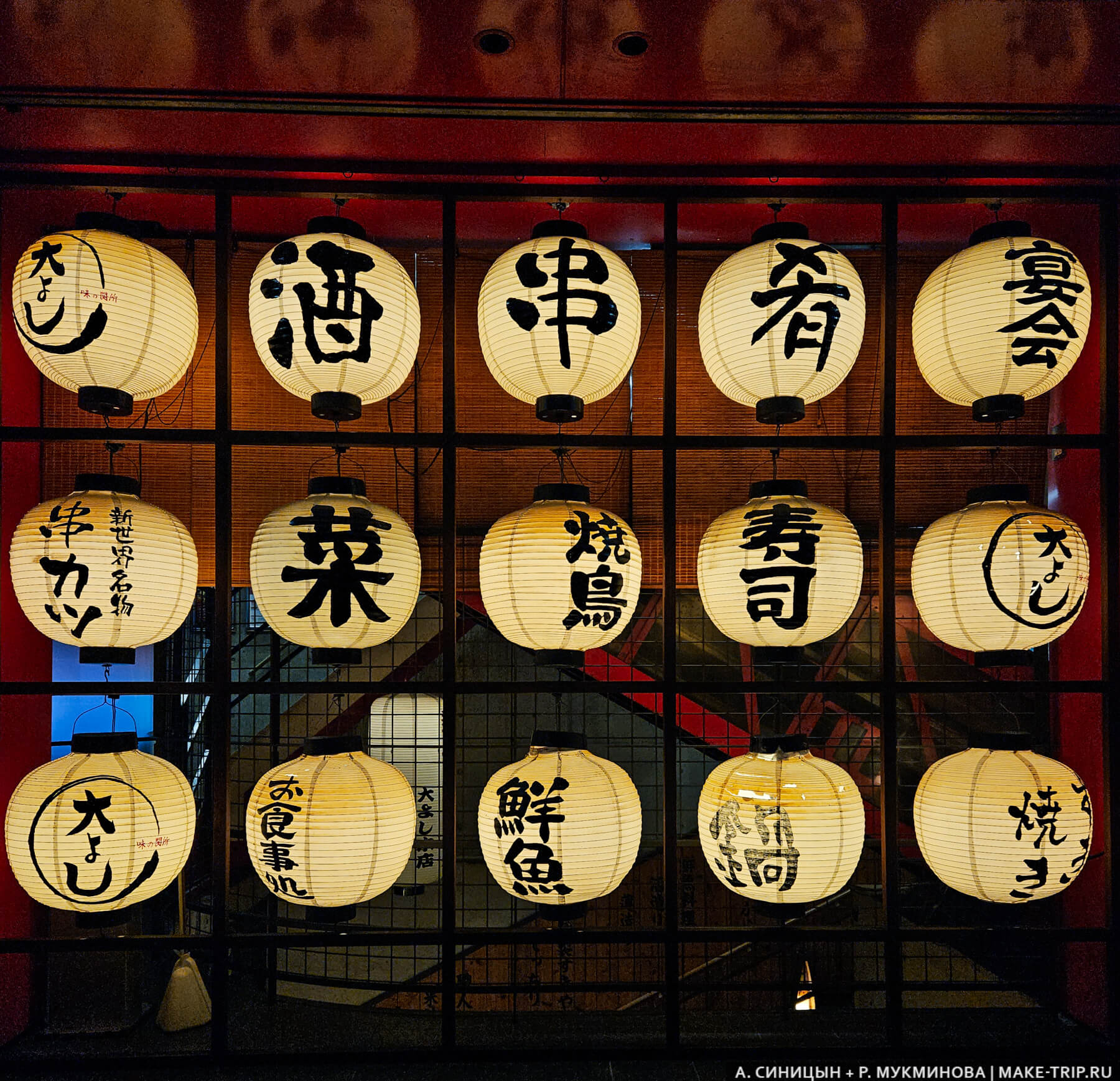 Зарядившись энергий, пошли смотреть район Синсэкай. Здесь уже обитают туристы, но не в таком безумном количестве, в котором мы позже увидим их в более раскрученных местах. Говорят, что южная половина района вдохновлена Нью-Йорком, а северная — Парижем. Мотивы уловить можно, но всё же сугубо японское явно доминирует. По японским меркам Синсэкай считается районом небезопасным: бомжи, бордели, заведения с азартными играми, в том числе совершенно безумные огромные салоны патинко, где толпы японцев играют в автоматы, выигрывают (если повезет) какое-нибудь барахло вроде сковородок, а потом обменивают их на деньги (такая вот хитрая схема по маскировке казино). В общем, место отличное, колоритное! С удовольствием здесь гуляли и дивились всему подряд.