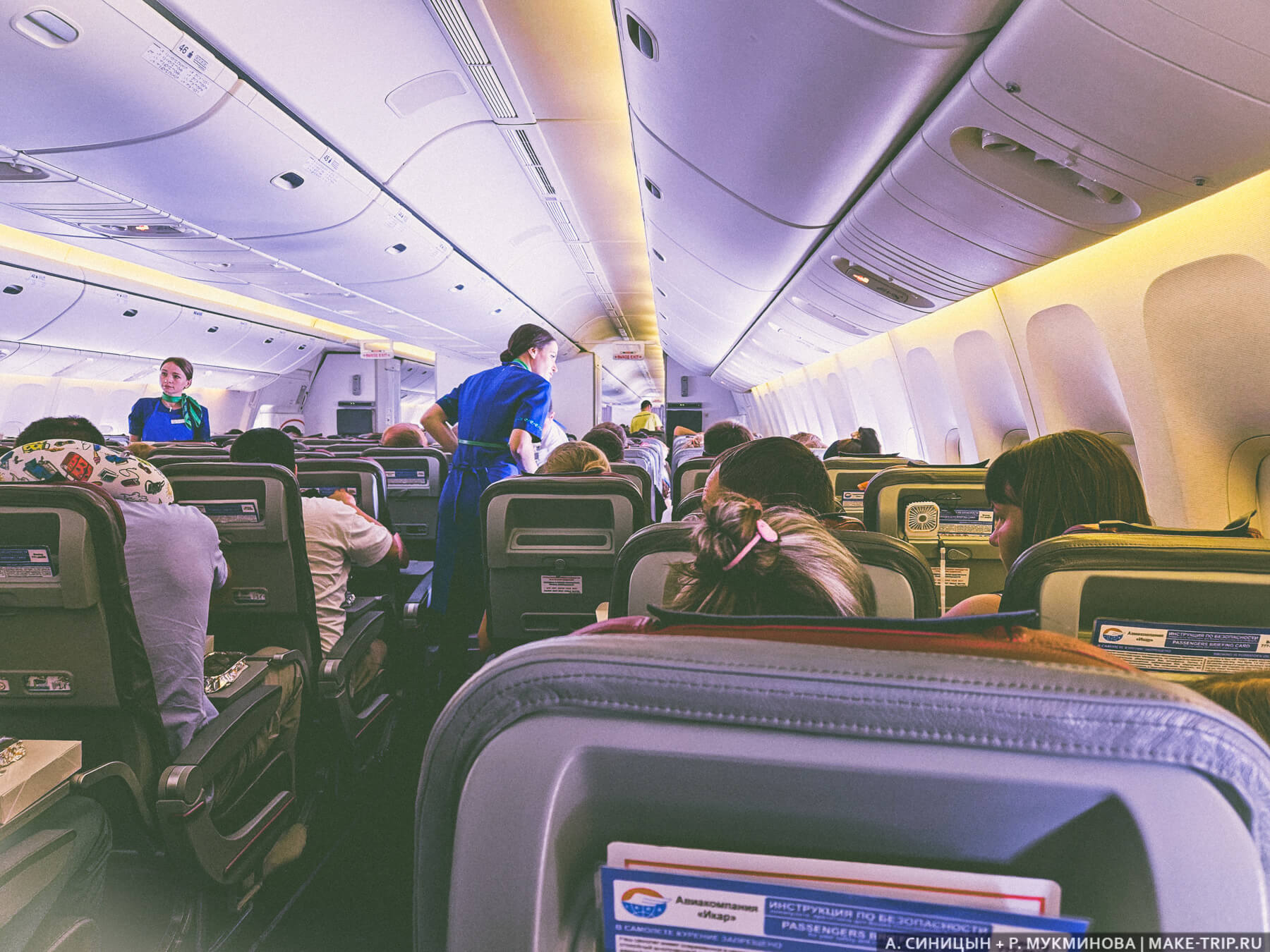 Борт Boeing 777-200 авиакомпании «Икар», на котором мы летели, был весьма уставшим, как и команда его бортпроводников. Контраст с перелетами на регулярных рейсах, конечно, разительный. Поломанные и расшатанные кресла не только без мультимедиа (что ожидаемо), но даже без кармана для вещей (вот сюрприз), замученный и неприветливый персонал, ну и питание... Один единственный прием пищи за восемь с половиной часов лёту, да и то кормили одним только хлебом в различных видах. Но страшней всего, что даже томатного сока не было — как же без него на высоте? Так что, друзья, обзаводитесь правильной кредиткой для путешествий и бесплатно обедайте в бизнес-залах, чтобы не нуждаться в самолетной пище. Вопреки всему, оба перелета прошли нормально: обстановка на борту была спокойной, публика собралась вполне приличная, а большую часть времени мы спали.